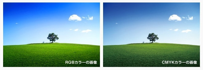 RGBカラーのデータをCMYKカラーへ変換するため、PCのモニター上の色合いと印刷後の色合いに差が出てしまい、仕上がりがくすんでしまいます。